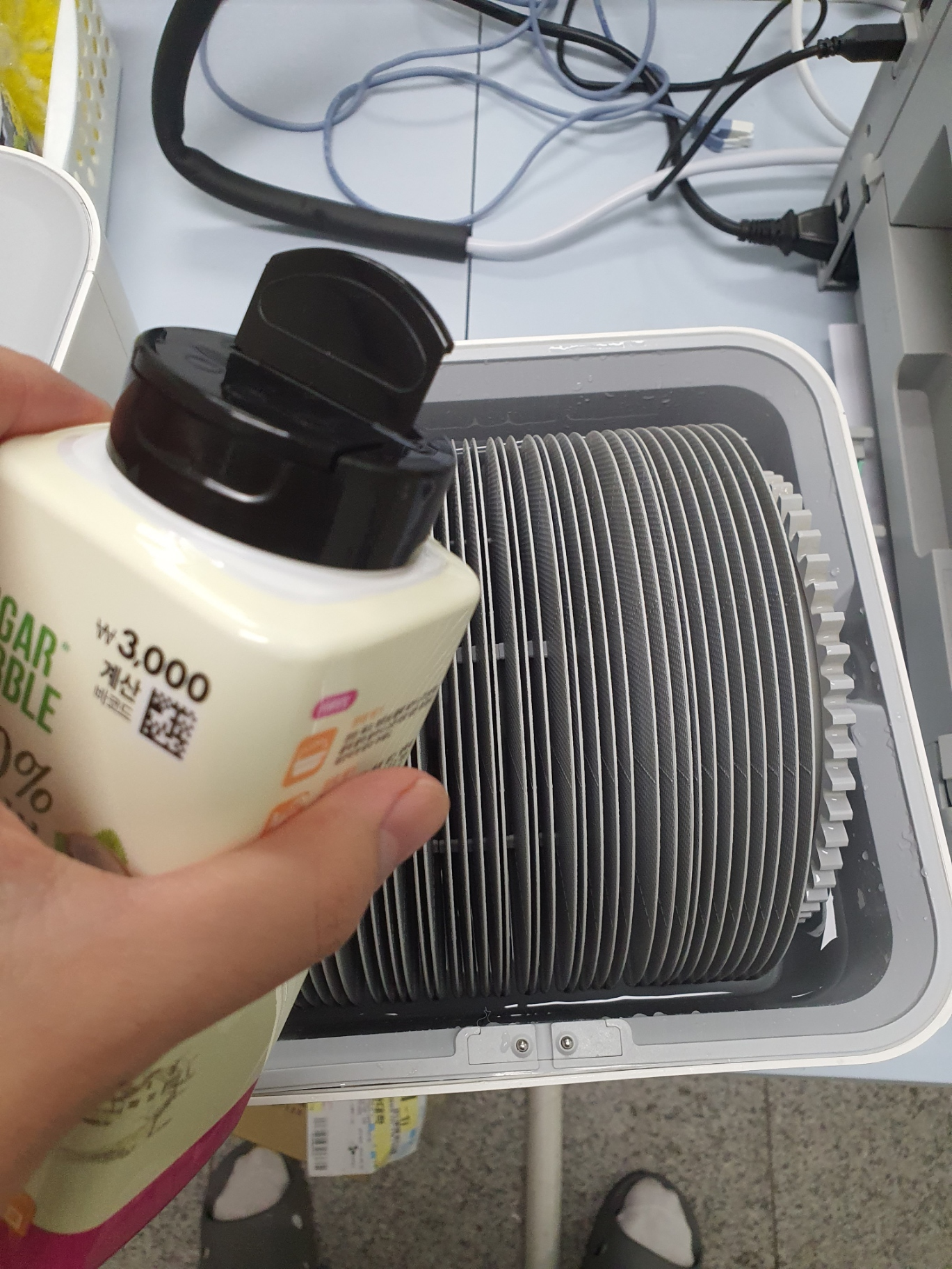 이후 생활하는 곳 밖에 전원이 들어오는 곳에 켜놓고 계속 가동하면 된다. 디스크가 계속 회전하며 구연산을 섞고 물때가 물에 녹아든다.