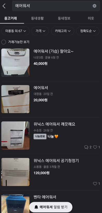 그래서 그런지 우리지역 당근마켓만 봐도 중고로 기화식 가습기(에어워셔)를 내놓은 곳이 많다.