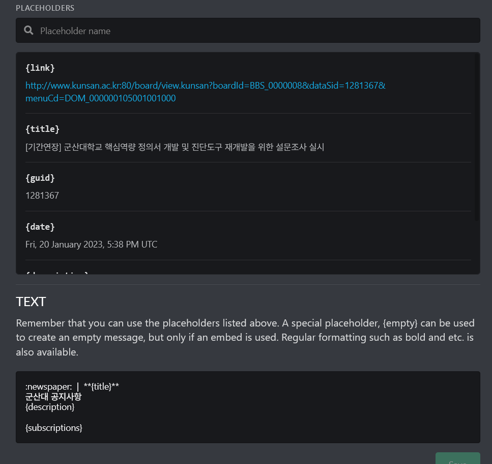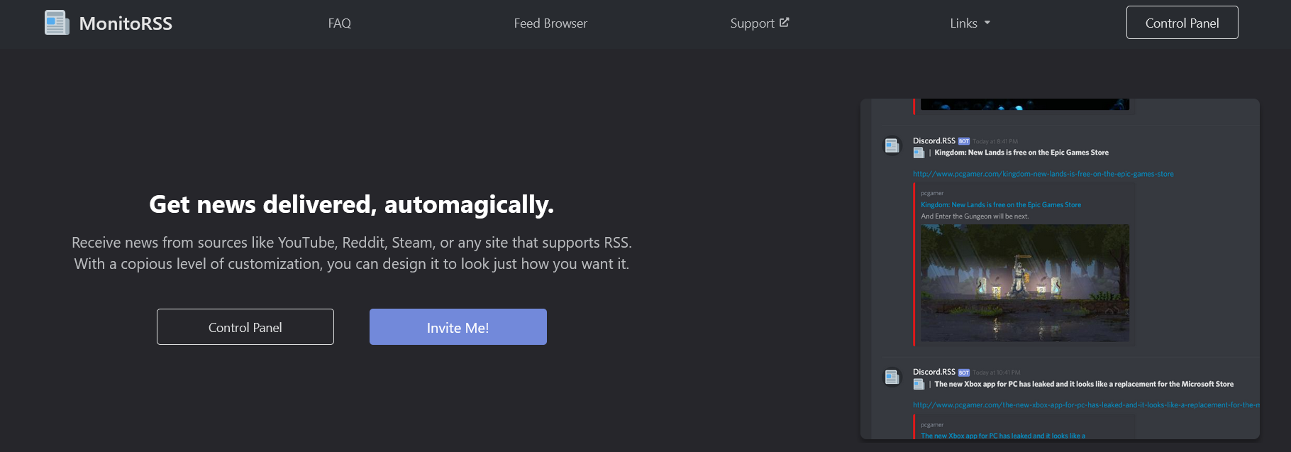 한가지 더 디스코드를 선정한 이유는 RSS를 주기적으로 확인하고 서버에 올려줄 봇이 서드파티로 존재한다. MonitoRSS를 사용하면 봇이 10분마다 RSS링크에 접속해 변경사항을 감지하고 변경사항 감지시 서버에 올려준다.