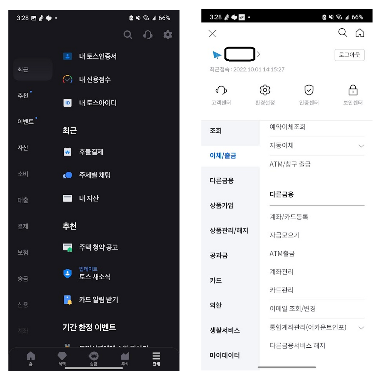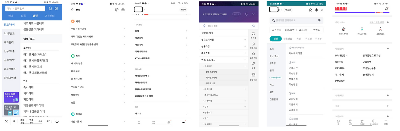 1번 신한은 작은 화면에 너무 많은 내비게이션(상단, 옆, 하단)과 집중을 분산시키는 배너가 있다. 특히 하단 내비게이션은 측면 및 상단과 아무 상관이 없다.