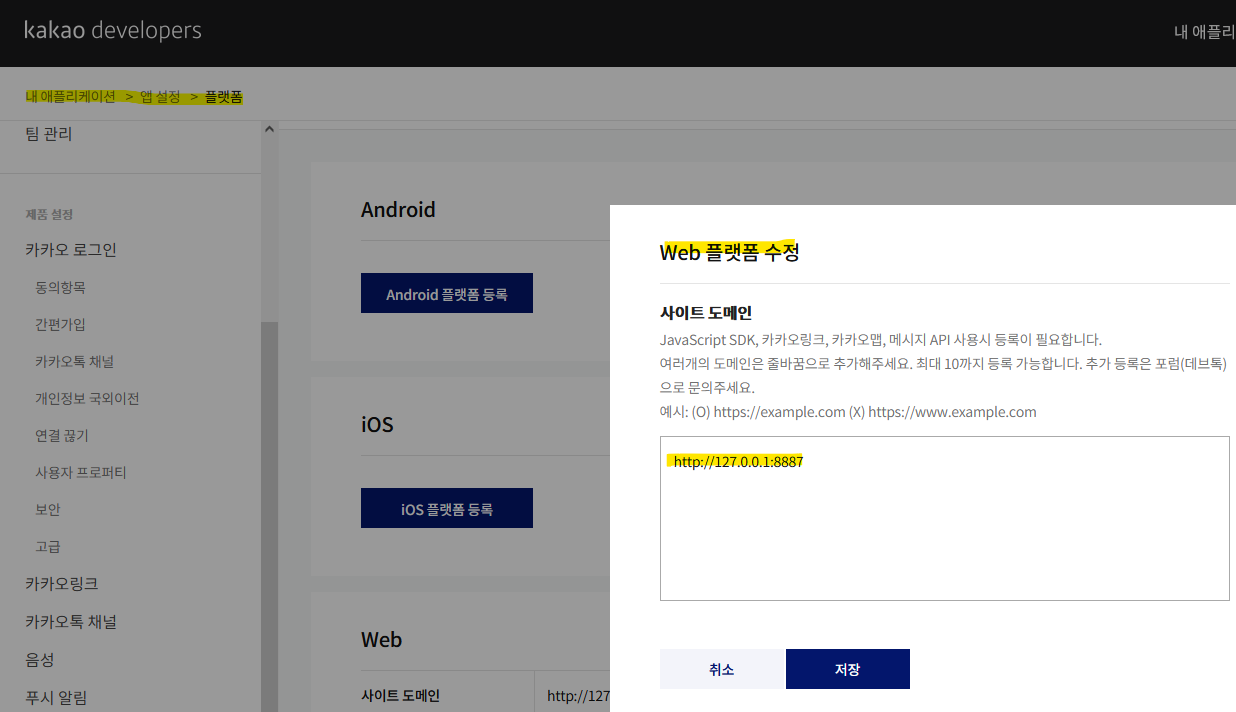 카카오 디벨로퍼에서 web플랫폼에 아까 열은 서버의 주소를 입력했다.